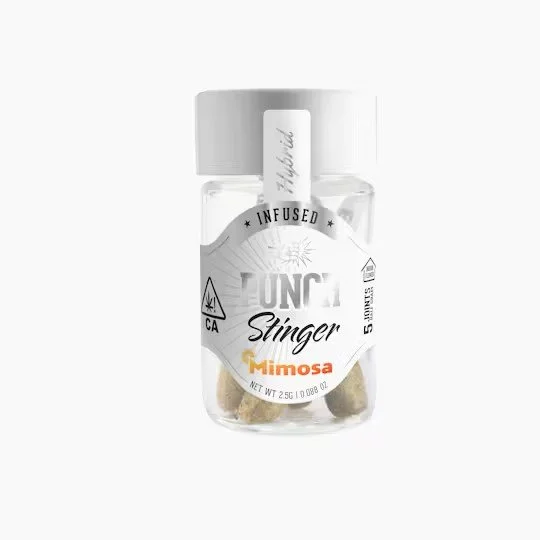 Try our Punch Stingers, a jar of 5 mini pre rolls infused with your favorite flavors and rolled in kief. Each mini joint offers a potent and flavorful smoke, leaving you in a state of blissful relaxation. Enjoy the convenience and premium quality of Punch Stingers for a truly enjoyable cannabis experience.